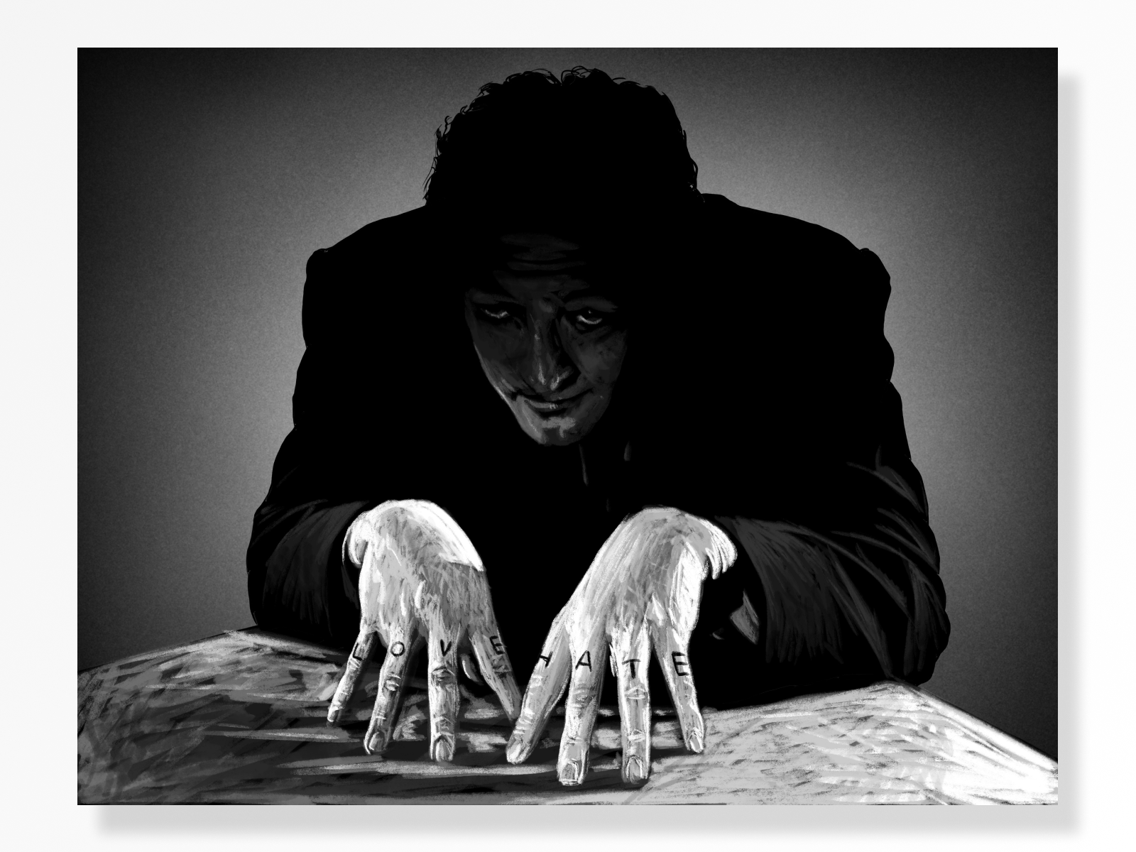 This is another drawing made with Procreate on iPad, this time experimenting with a more conventional black and white drawing. I actually ended up drawing only with white on multiple layers, then adjusting the mid-tone balance with the opacity of those layers, which worked well and allowed for a lot of fine-tuning to achieve the murky qualities here. The reference image is a fantastic photo of Robert Mitchum from the 1953 film The Night of the Hunter, which is on my Mt. Rushmore of black-and-white-as-aesthetic films.
